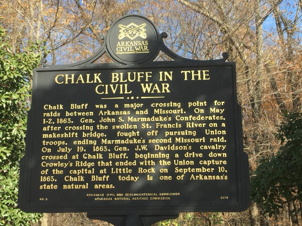 The town of Chalk Bluff, now long gone, was the site of several skirmishes during the Civil War, the most significant of which was the May 1-2, 1863 action as General John S. Marmaduke retreated from an unsuccessful raid into Missouri. source